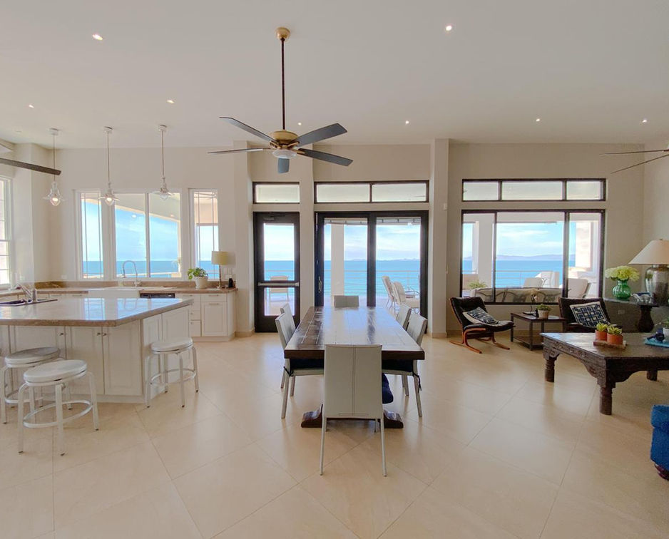 Cocina completamente equipada con electrodomésticos de acero inoxidable y hermosa vista al mar.